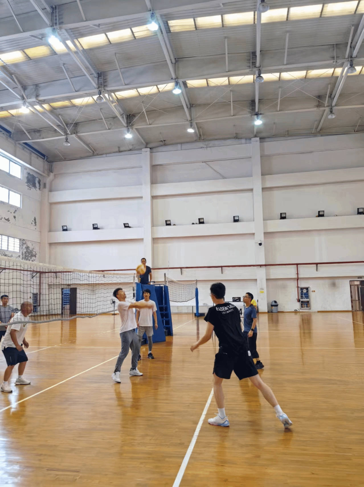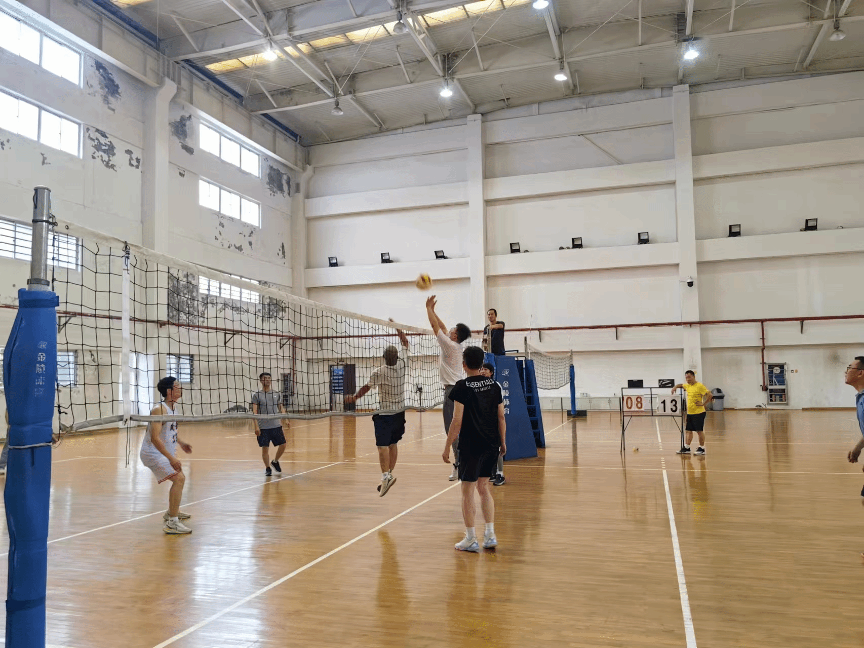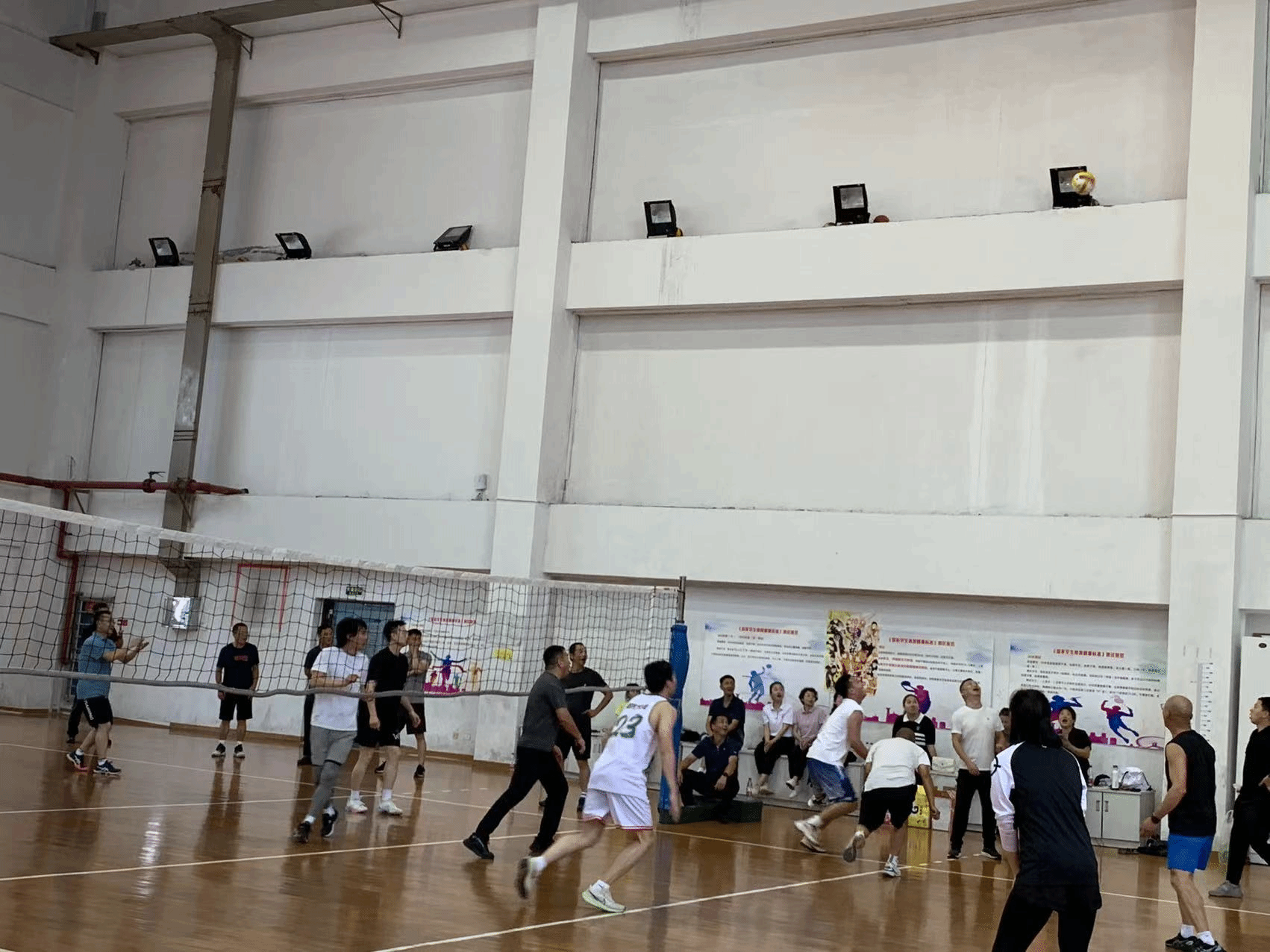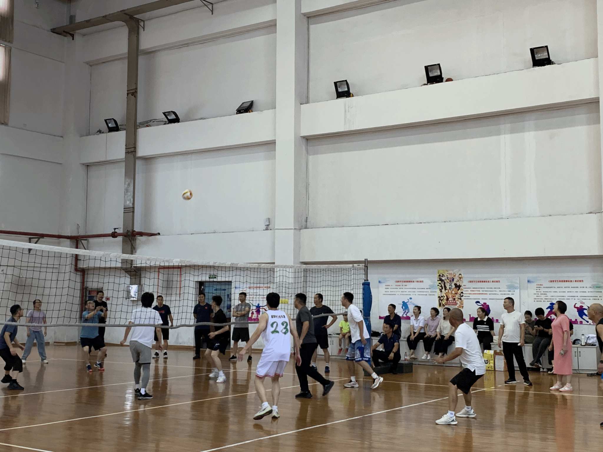 比赛分为两支队伍:院长队由小球教研室和综合教研室的老师们组成,书记队由大球教研室和体操教研室的老师们组成,行政老师随机分到两个队。两队的老师们个个精神抖擞,信心十足,他们在赛前进行了充分的热身和准备,力争在比赛中取得好成绩。随着裁判员一声哨响,比赛正式拉开帷幕。两队在场上展开了激烈的对决,双方队员都展现出了高超的排球技术和顽强的拼搏精神。书记队凭借着大球教研室和体操教研室的强大实力,迅速在第一局中取得了领先。他们的进攻犀利,防守严密,配合默契,不时打出精彩的扣杀和拦网,赢得了场外观众的阵阵掌声和喝彩。院长队也不甘示弱,小球教研室和综合教研室的队员们沉着冷静,稳扎稳打,逐渐找到了比赛的节奏。他们通过灵活多变的战术和默契的团队合作,奋力反击,以25:23成功拿下第一局。