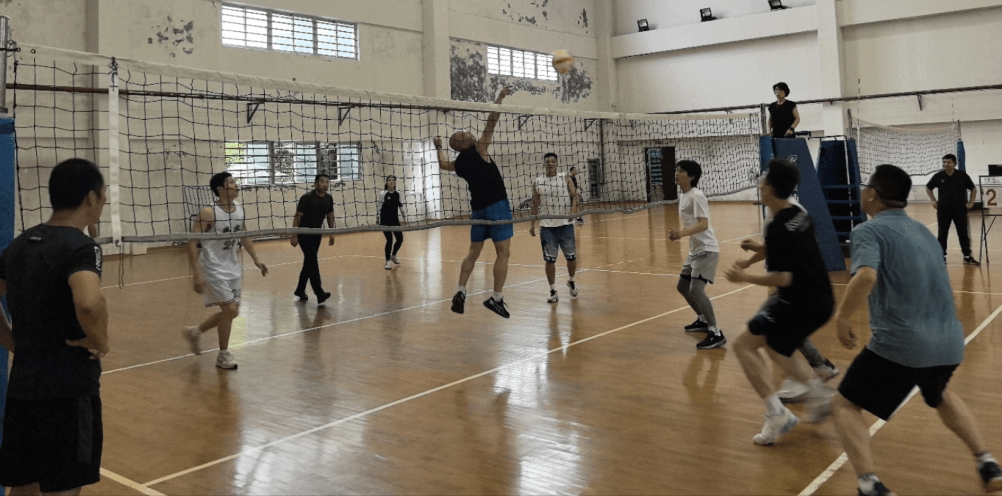 第二局比赛进入了白热化阶段,双方你来我往,比分交替上升,场面异常激烈。院长队凭借顽强的意志和不懈的努力,展现出了更强的团队协作能力和战术素养。他们通过精准的发球、快速的移动和犀利的进攻,逐步掌握了比赛的主动权。尽管书记队的队员们拼尽全力,奋力抵抗,将比分拉到2分的差距,但最终还是未能逆转局势。院长队以25:21的比分赢得了最后的胜利,成为本次比赛的获胜者。