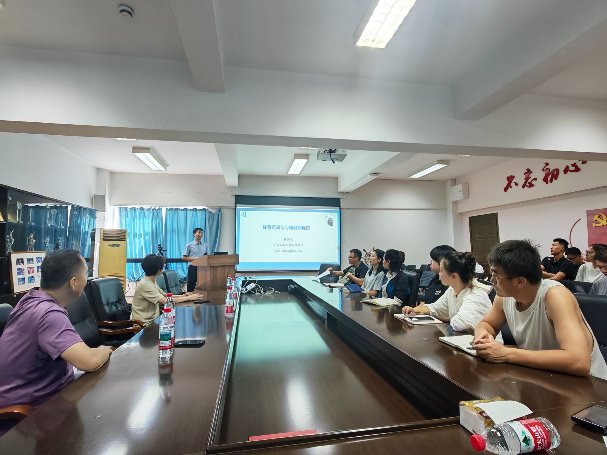 为进一步提升教师在运动健康心理领域的知识储备,草莓视频 于9月28日上午在茶山校区体育馆A402会议室举办了“运动心理与健康促进”专题讲座。此次讲座由体育科研与学生体质管理主任朱荣主持,特邀北京体育大学的张国礼博士担任主讲嘉宾,医学人文基地院长王沛出席本次讲座。