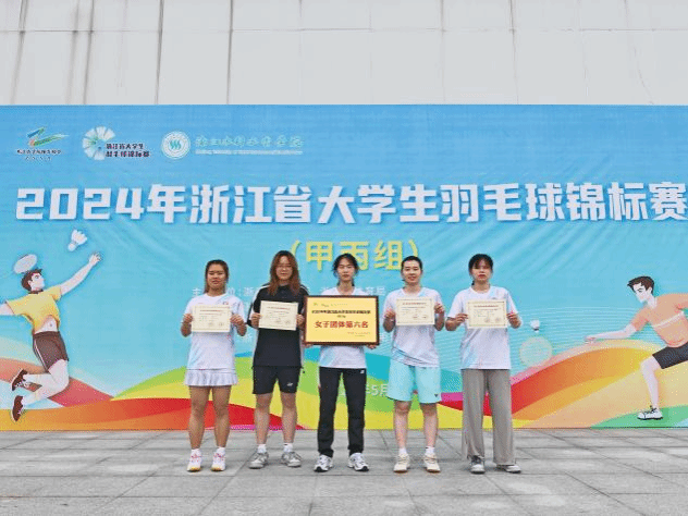 5月20日至24日,2024年浙江省大学生羽毛球锦标赛(甲丙组)在湖州南浔浙江水利水电学院落下帷幕。本次锦标赛由浙江省教育厅、浙江省体育局主办,省内共70多所高校、500多名运动员参加竞技。由王在韬担任教练的我校代表队在比赛中不畏强手,打出了风格,赛出了水平, 经过为期五天的奋勇拼搏,在成绩上取得历史性突破,王喻菡和干佳伊在女子单打项目中分别获得亚军和第八名;女团荣获第六名。