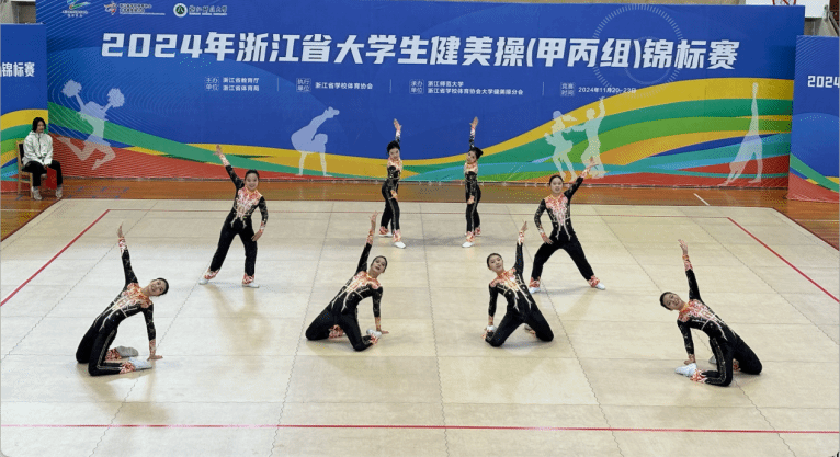 2024年浙江省健美操(甲丙组)锦标赛在金华浙江师范大学圆满落幕。草莓视频 健美操队荣获花球啦啦操第三名和有氧舞蹈第四名,体育舞蹈队荣获华尔兹双人单项第一名,团体舞自编第三名,最终总成绩第五名。