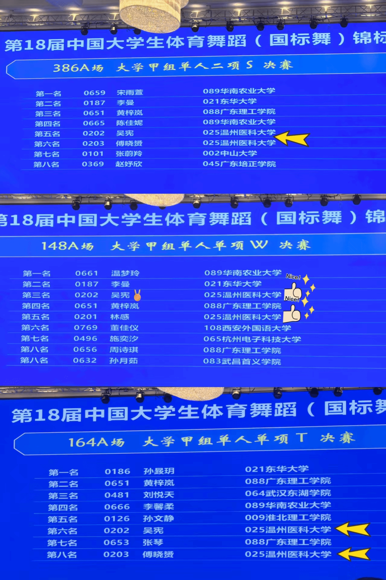 6月上旬,第18届中国大学生体育舞蹈锦标赛在河南省郑州市圆满落幕。温医大学子在本次大赛中表现不俗,由王筱玮老师带队的3名参赛选手在激烈角逐中脱颖而出,在3个参赛项目中均有队员挺进决赛,最终取得1项第三名、2项第五名、2项第六名和1项第八名的优异成绩,为学校赢得了荣誉。
